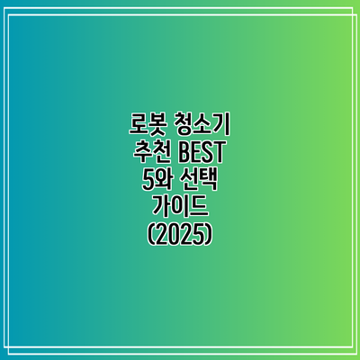 2025년에 추천하는 로봇 청소기 BEST 5를 통해 본인에게 맞는 제품을 찾는 데 도움이 되길 바라요. 로봇 청소기는 여러분의 시간을 절약하고, 삶의 질을 향상시켜 줄 수 있는 스마트한 가전제품이에요. 이젠 편리함을 누려보세요!