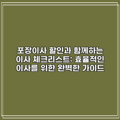 이사를 계획하고 있는 분들께 중요한 정보가 가득합니다. 이사라는 큰일 앞에 서 있는 여러분의 마음은 불안하고 복잡할 수 있어요. 하지만, 포장이사 할인과 함께하는 효율적인 이사 체크리스트를 잘 준비하면 이사를 매끄럽게 진행할 수 있답니다. 이제 포장이사의 개념과 장점, 그리고 효율적인 이사를 위한 체크리스트를 통해 스트레스를 줄여보아요.